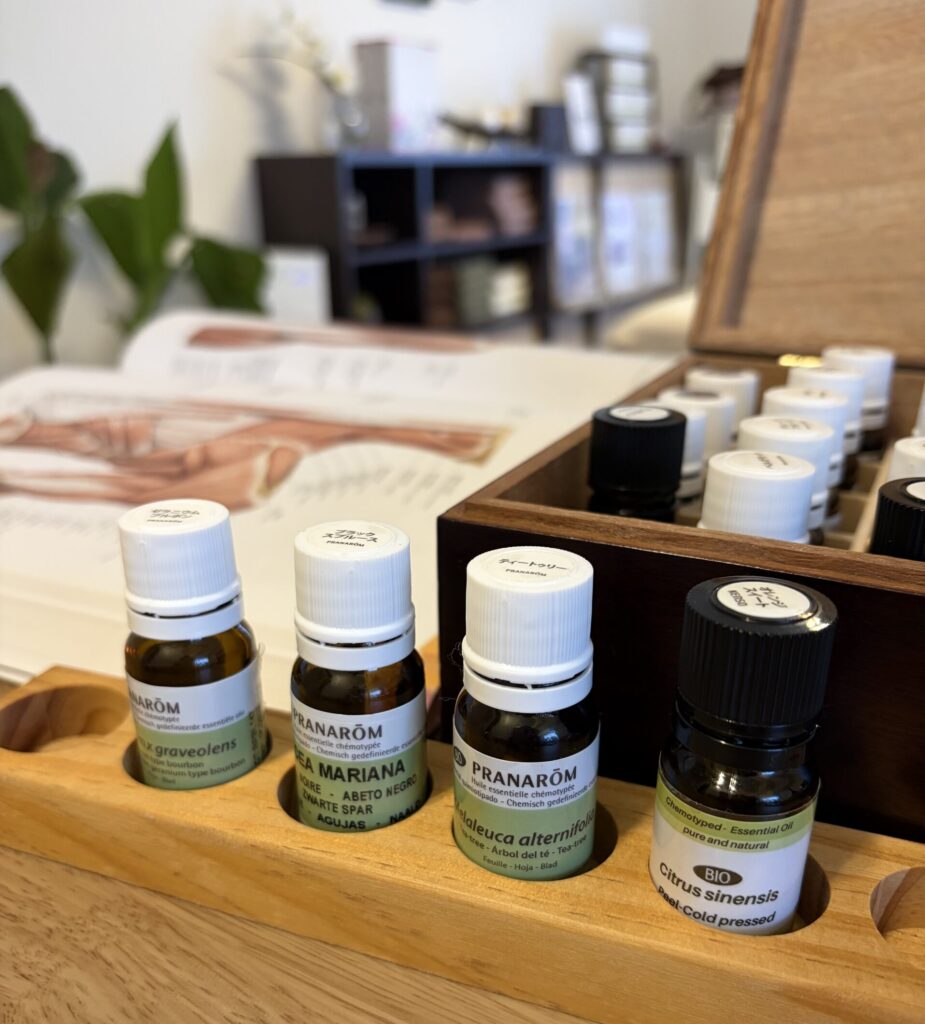 当サロンのアロマ(精油)は、「心地よい香り」と感じるリラクゼーション目的だけでなく、解剖学に基づいたアプローチを最大化するためのツールとして活用しています。