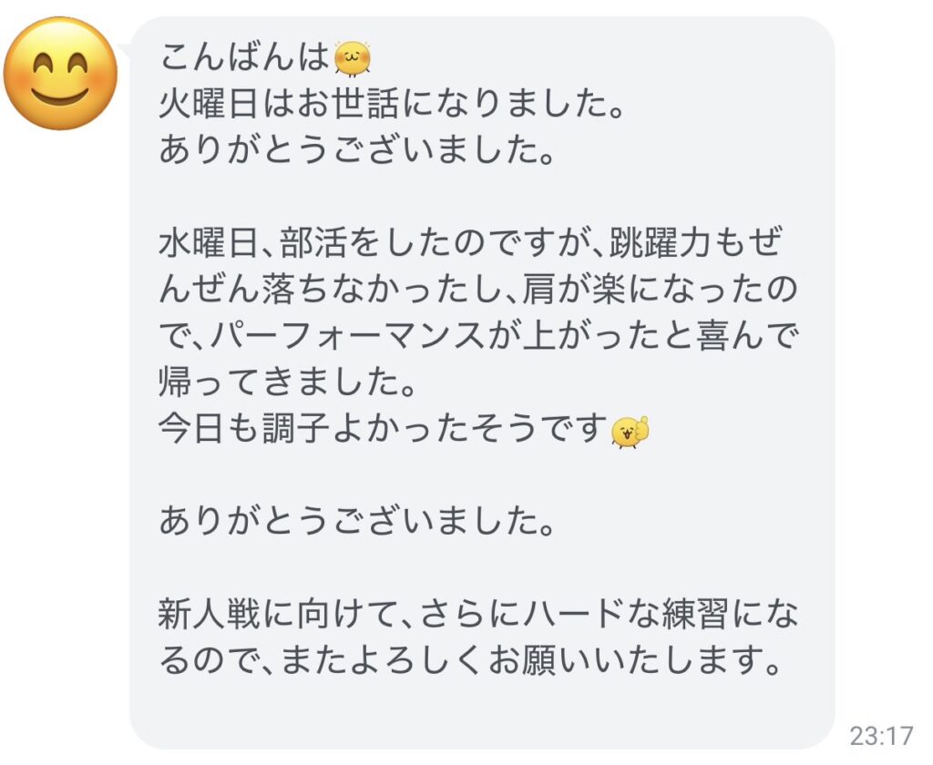 「水曜日(ケアの翌日)、部活をしたのですが、跳躍力もぜんぜん落ちなかったし、肩が楽になったので、パフォーマンスが上がったと喜んで帰ってきました。今日も調子よかったそうです」
